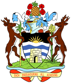 Andre skriver.: Det nationale flag og emblem blev officielt, da nationen blev uafhængig i 1967, 300 år efter at være blevet en britisk koloni. Ideer om design blev offentligt opfordret til året før, i 1966, og mere end 600 indsendelser blev foretaget. High school kunstlærer Reginald Samuels ‘design blev valgt. Solen i midten symboliserer opvågningen af den nye æra, rød, forfædrenes blod og vitalitet hos beboerne, sorte, sorte mennesker og blå, håb. Derudover repræsenterer det V-formede design sejr.